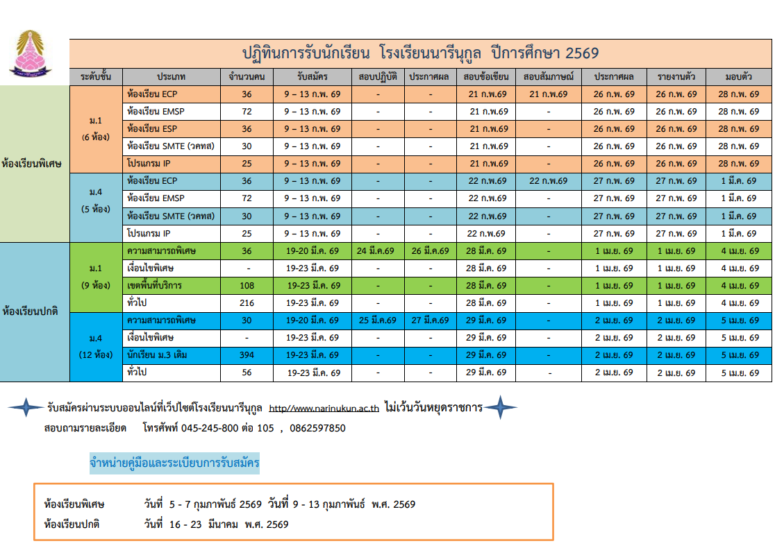 ปฏิทินการรับนักเรียน โรงเรียนนารีนุกูล ปีการศึกษา 2569 14 ม.ค. 69